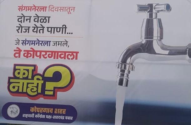 संगमनेर ( प्रतिनिधी ) संगमनेरमध्ये दररोज पाणी येते, जे संगमनेरला जमले ते कोपरगावला का नाही? ” असा प्रश्न उपस्थित करणारे फलक कोपरगाव शहरात लागले आहे, त्यामुळे संगमनेरच्या पाणी योजनेची चर्चा पुन्हा जोर धरू लागली. अहमदनगर जिल्ह्यात दररोज दोन वेळा पूर्ण दाबाने पाणी मिळणारे संगमनेर हे एकमेव शहर आहे.